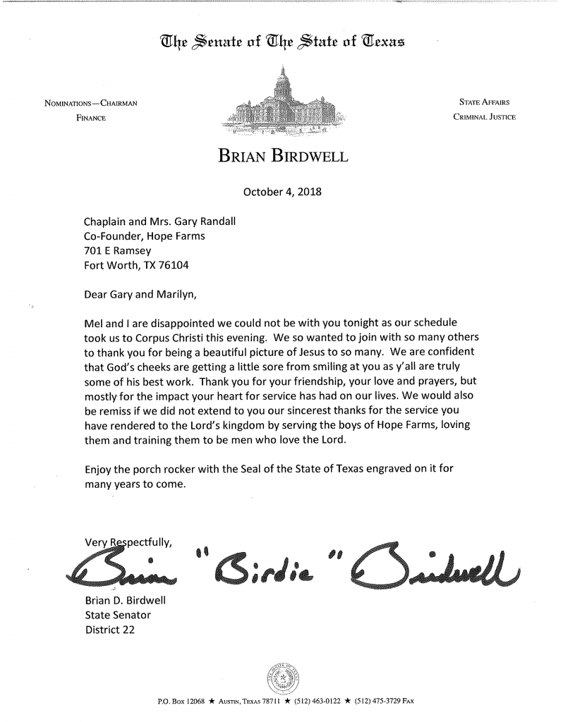 October 11, 2018 at 3:30 pmDear Gary and Marilyn…. Your ministry to HOPE FARM will leave lasting impact on so MANY wonderful young boys. Thank you for ALL that you have done for them!! Thanks also for serving on the Christian Prayer Breakfast Board for MANY years!